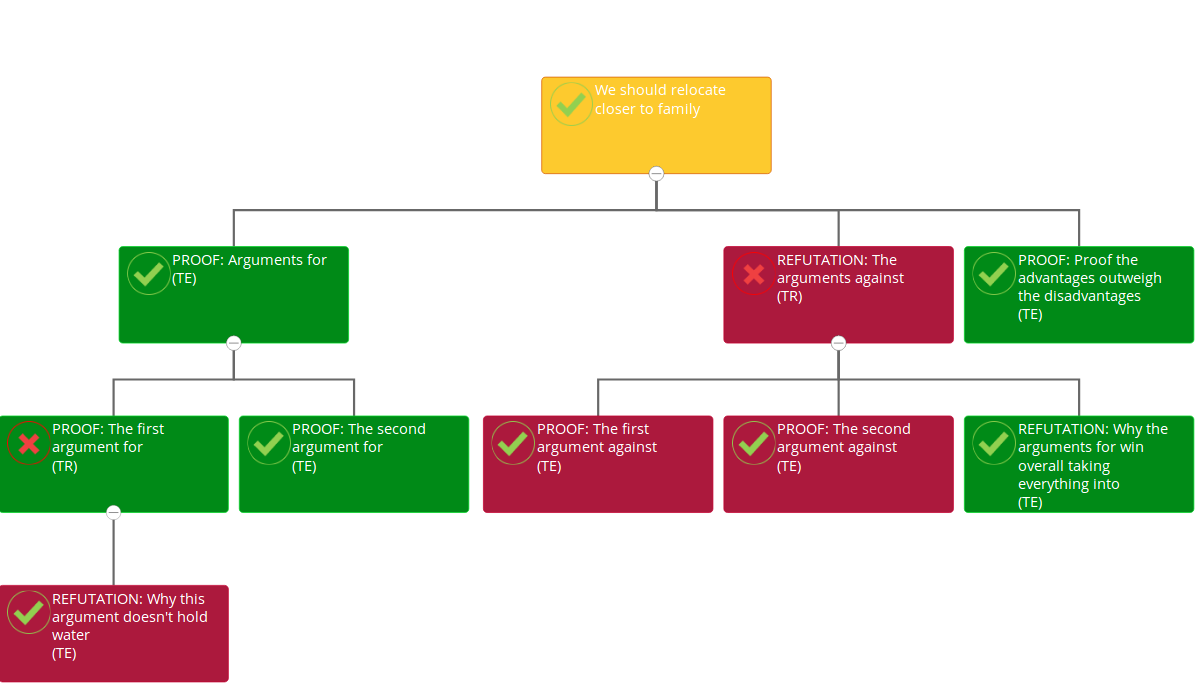 First post the topic statement, for example: I should make decision X. Then make a proof for it "The argument for X" and a challenge of it "the argument against X". Then add whatever different arguments in favor you have as proofs of "The argument for X", and arguments against as proofs of "the argument against X". Figure 1.