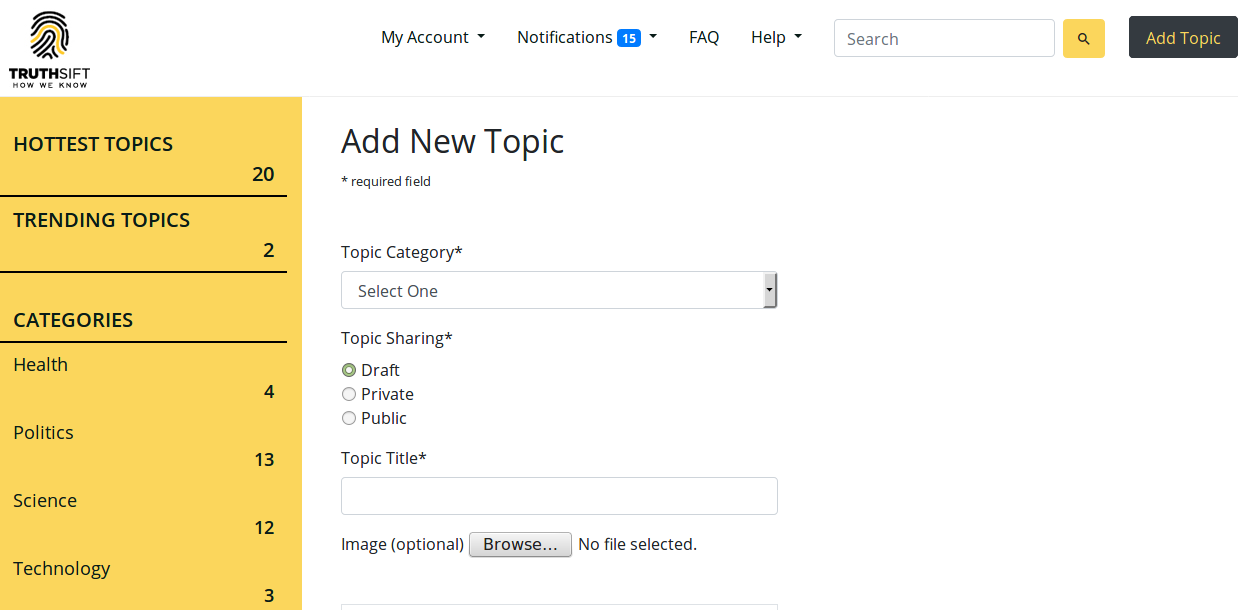 To do all this is easy. Sign up. Then Hit Add Topic at the top right of any TruthSift page.