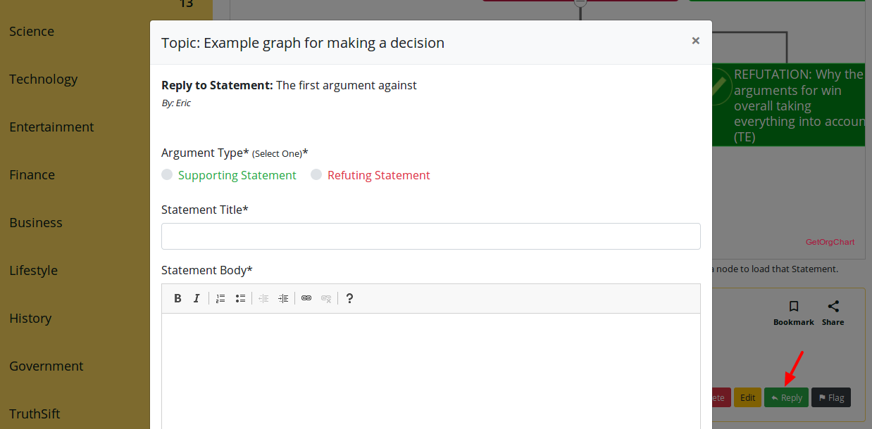 You will see the gold topic statement. Scroll down until you see the statement body and select "reply" to get started by adding your first supporting or refuting reply.